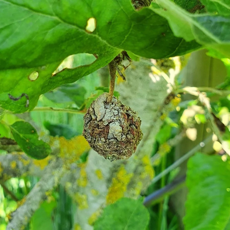 Or you’ve already met Brown rot! Brown rot is a fungal infection which attacks most orchard fruit. You will have brown, almost swollen, rotten fruit with white pustules still hanging onto the tree. Often next to healthy fruit. As it gets older the fruit will desicate or mummify.