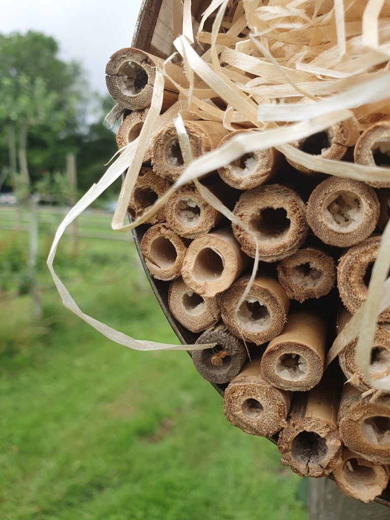 Bee hotels can be species specific or general. It can be as simple as putting a big structure in and filling it with allsorts of bedding such as straw, bamboo, pine cones etc. There is nothing wrong with this and it will soon be teaming with life. I have made nests specific for earwigs and solitary bee/wasp hotels. Lacewing homes will be next and Ladybirds and spiders will use any of these to their advantage, even if its at the back. I want the life to be in the trees so they don’t get distracted elsewhere.