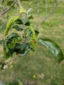 Tell tale signs are the curled leaves on apple trees but even more helpful is the red on the leaves! If you open up the curled leaves you can see the aphids inside.
