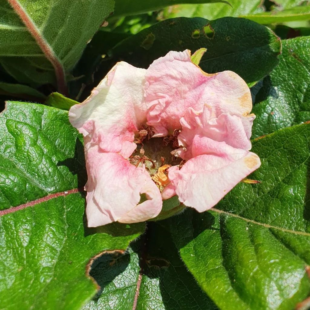 The trees themselves are very interesting and much like the fruit they differ to other fruit trees. They have lovely blossom with a frilly edge to the petals, Some years, the flowers are white and some years pink…I’m not sure why. In Autumn, the leaves are stunning and have very autumnal shades different to the rest of the orchard, Just look at that copper colour coming through.